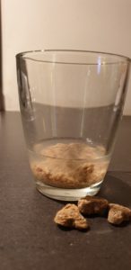 Ik vroeg mij af of de lijnzaad brokjes ook deze eigenschap in zich hebben, en heb een testje gedaan door 1 deel harde stof in 4 delen warm (lichaamstemperatuur) water te leggen.